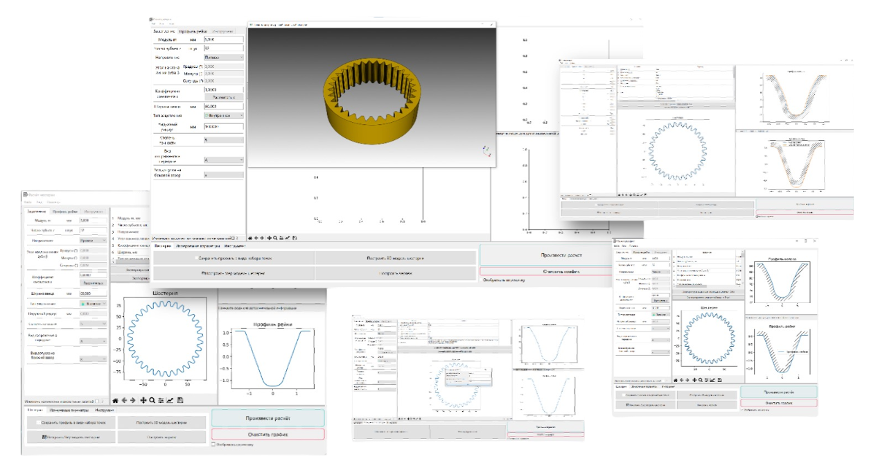 Помогает выбрать вариант зацепления при заданном межосевом расстоянии для различных профилей инструментов с учетом множества параметров и ограничений. Позволяет фильтровать полученные результаты и получать графическое изображение итогового зацепления, а также строить различные варианты графиков с произвольными параметрами.