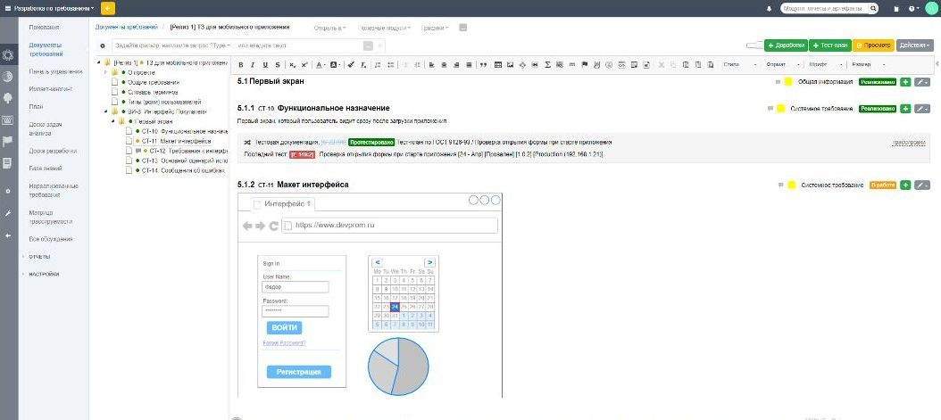 Система Devprom предоставляет «зрелые» инструменты для управления требованиями, включающими редактор документов, который, помимо текста, позволяет работать с таблицами, изображениями, вводить математические формулы и создавать UML-диаграммы. Это позволяет вносить всю необходимую информацию в документ в полной мере без применения сторонних программных продуктов. Кроме того, интегрированные механизмы согласования разрабатываемых документов и инструменты трассировки требований, используемые для контроля выполнения требований, а также в процессах изменения и управления конфигурацией изделия, делают работу с системой более гибкой и удобной.